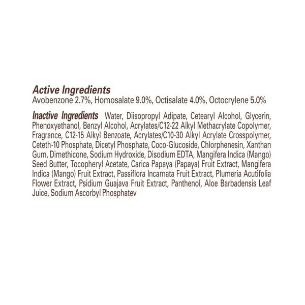 Water, Ethylhexyl Benzoate, Butyloctyl Salicylate, Cetearyl Alcohol, Diisopropyl Adipate, Phenethyl Benzoate, Phenoxyethanol, Polymethylsilsesquioxane, Vp/eicosene Copolymer, Caprylyl Glycol, Dimethicone, Glycerin, Fragrance, Triethanolamine, Coco-glucoside, Acrylates/c10-30 Alkyl Acrylate Crosspolymer, Methylparaben, Ceteth-10 Phosphate, Dicetyl Phosphate, Propylparaben, Disodium Edta, Paraffin, Xanthan Gum, Butyrospermum Parkii (shea) Butter, Mangifera Indica (mango) Seed Butter, Sodium Ascorbyl Phosphate, Tocopheryl Acetate, Panthenol, Aloe Barbadensis Leaf Juice, Carica Papaya (papaya) Fruit Extract, Colocasia Antiquorum Root Extract, Mangifera Indica (mango) Fruit Extract, Passiflora Incarnata Fruit Extract, Plumeria Acutifolia Flower Extract, Psidium Guajava Fruit Extract.