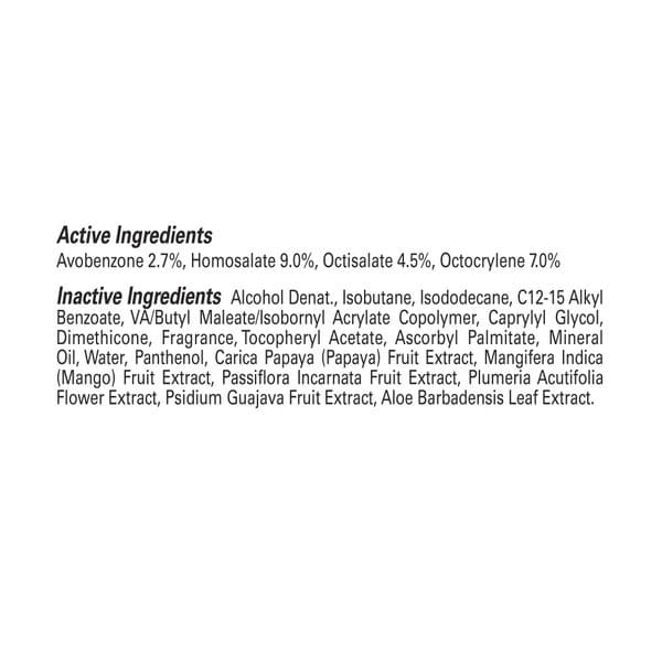 Alcohol Denat., Isobutane, Isododecane, Diisopropyl Adipate, Va/butyl Maleate/isobornyl Acrylate Copolymer, Caprylyl Glycol, Dimethicone, Fragrance, Mineral Oil, Ascorbyl Palmitate, Tocopheryl Acetate, Panthenol, Water, Carica Papaya (papaya) Fruit Extract, Colocasia Antiquorum Root Extract, Mangifera Indica (mango) Fruit Extract, Passiflora Incarnata Fruit Extract, Plumeria Acutifolia Flower Extract, Psidium Guajava Fruit Extract, Aloe Barbadensis Leaf Extract.