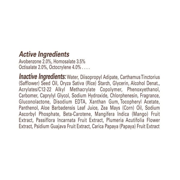 Water, Isohexadecane, Diisopropyl Adipate, Ethylhexyl Benzoate, Butylene Glycol, Hydroxyethyl Acrylate/sodium Acryloyldimethyl Taurate Copolymer, Cetearyl Alcohol, Acrylates/c12-22 Alkyl Methacrylate Copolymer, Phenoxyethanol, Caprylyl Glycol, Methylparaben, Ceteth-10 Phosphate, Dicetyl Phosphate, Fragrance, Propylparaben, Polysorbate 60, Disodium Edta, Xanthan Gum, Aminomethyl Propanol, Mica, Tocopheryl Acetate, Titanium Dioxide, Panthenol, Aloe Barbadensis Leaf Juice, Silk Amino Acids, Sodium Ascorbyl Phosphate, Carica Papaya (papaya) Fruit Extract, Colocasia Antiquorum Root Extract, Mangifera Indica (mango) Fruit Extract, Passiflora Incarnata Fruit Extract, Plumeria Acutifolia Flower Extract, Psidium Guajava Fruit Extract, Iron Oxides.