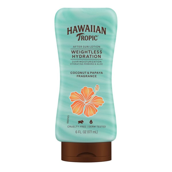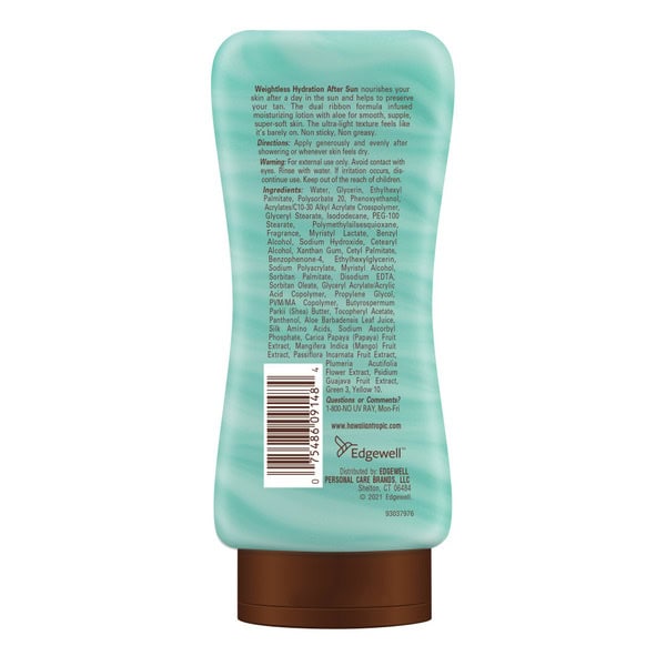 Hawaiian Tropic Weightless Hydration After Sun Lotion nourishes your skin after a day in the sun. This unique dual-ribbon hydrating after sun skincare SPF is made with shea butter and aloe for 24-hour skin hydration and leaves skin feeling super soft while helping to preserve your tan. This nourishing body lotion is non-sticky and non-greasy, for a weightless hydrating experience. Hawaiian Tropic After Sun Lotion is made with island-inspired botanicals like papaya, mango and plumeria. Hawaiian Tropic SPF provides broad spectrum UVA/UVB protection and is free from oxybenzone for skin-loving suncare you can trust.