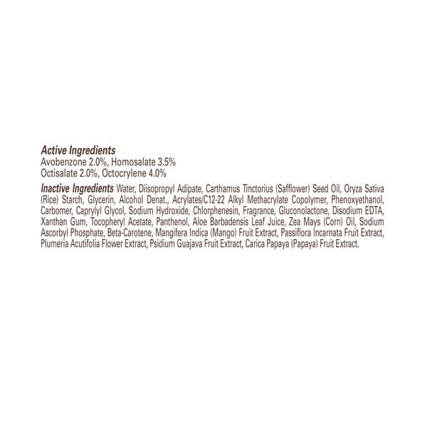Inactive Ingredients: Water, Diisopropyl Adipate, Carthamus Tinctorius (safflower) Seed Oil, Oryza Sativa (rice) Starch, Glycerin, Alcohol Denat., Acrylates/c12-22 Alkyl Methacrylate Copolymer, Phenoxyethanol, Carbomer, Caprylyl Glycol, Sodium Hydroxide, Chlorphenesin, Fragrance, Gluconolactone, Disodium Edta, Xanthan Gum, Tocopheryl Acetate, Panthenol, Aloe Barbadensis Leaf Juice, Zea Mays (corn) Oil, Sodium Ascorbyl Phosphate, Beta-carotene, Mangifera Indica (mango) Fruit Extract, Passiflora Incarnata Fruit Extract, Plumeria Acutifolia Flower Extract, Psidium Guajava Fruit Extract, Carica Papaya (papaya) Fruit Extract