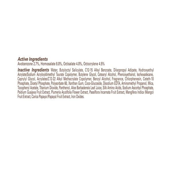 Inactive Ingredients: Water, Carthamus Tinctorius (safflower) Seed Oil, Diisopropyl Adipate, Oryza Sativa (rice) Starch, Glycerin, Acrylates/c12-22 Alkyl Methacrylate Copolymer, Alcohol Denat., Phenoxyethanol, Carbomer, Caprylyl Glycol, Sodium Hydroxide, Chlorphenesin, Fragrance, Gluconolactone, Xanthan Gum, Disodium Edta, Tocopheryl Acetate, Panthenol, Aloe Barbadensis Leaf Juice, Zea Mays (corn) Oil, Sodium Ascorbyl Phosphate, Beta-carotene, Carica Papaya (papaya) Fruit Extract, Mangifera Indica (mango) Fruit Extract, Passiflora Incarnata Fruit Extract, Plumeria Acutifolia Flower Extract, Psidium Guajava Fruit Extract