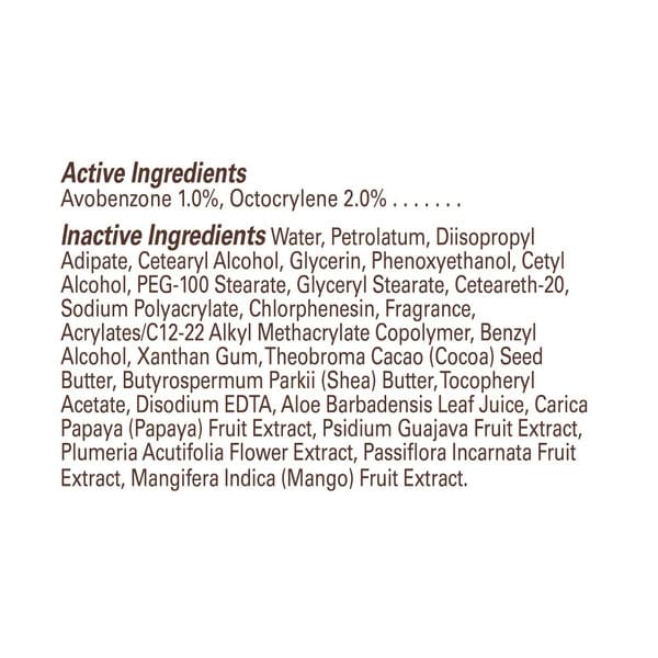Water, Petrolatum, Diisopropyl Adipate, Propylene Glycol, Polyglyceryl-3 Methylglucose Distearate, Cetyl Alcohol, Glyceryl Stearate, Peg-100 Stearate, Acrylates/c10-30 Alkyl Acrylate Crosspolymer, Triethanolamine, Benzyl Alcohol, Theobroma Cacao (cocoa) Seed Butter, Butyrospermum Parkii (shea) Butter, Disodium Edta, Peg-8 Dimethicone, Aloe Barbadensis Leaf Juice Powder, Carica Papaya (papaya) Fruit Extract, Colocasia Antiquorum Root Extract, Mangifera Indica (mango) Fruit Extract, Passiflora Incarnata Fruit Extract, Plumeria Acutifolia Flower Extract, Psidium Guajava Fruit Extract, Octyldodecanol, Retinyl Palmitate, Silica, Tocopheryl Acetate, Ascorbic Acid, Sodium Propoxyhydroxypropyl Thiosulfate Silica, Methylparaben, Propylparaben, Quaternium-15, Fragrance.