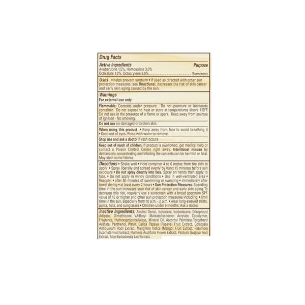 Shake well. Hold container 4 to 6 inches from the skin to apply. Spray liberally and spread evenly by hand 15 minutes before sun exposure. Do not spray directly into face. Spray on hands then apply to face. Do not apply in windy conditions. Use in well-ventilated area. Reapply: after 80 minutes of swimming or sweating; immediately after towel drying; at least every 2 hours. Sun Protection Measures. Spending time in the sun increases your risk of skin cancer and early skin aging. To decrease this risk, regularly use a sunscreen with a broad spectrum SPF of 15 or higher and other sun protection measures including: limit time in the sun, especially from 10 a.m. – 2 p.m.; wear long-sleeved shirts, pants, hats, and sunglasses. Children under 6 months: Ask a doctor. Protect this product from excessive heat and direct sun.
