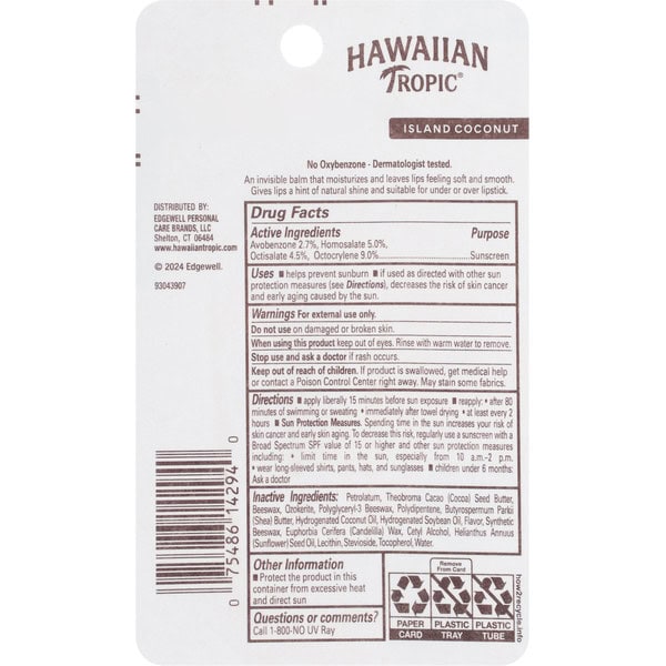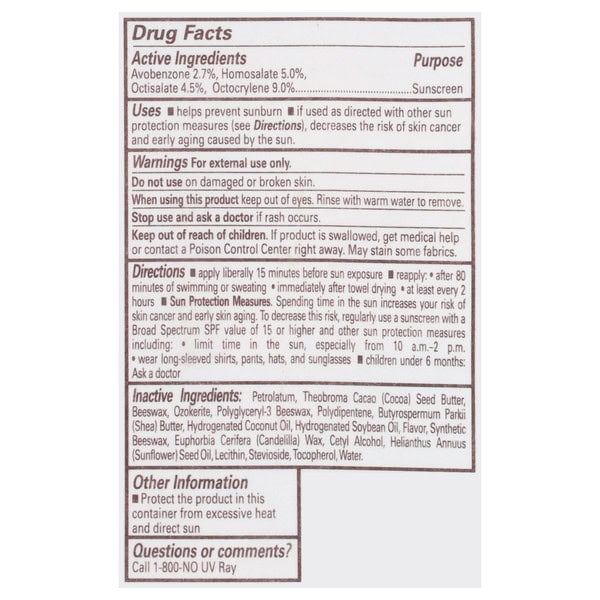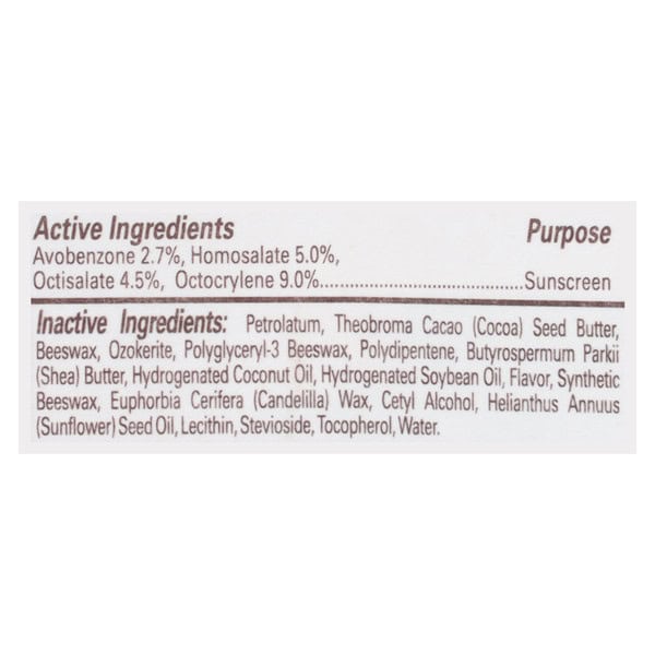 Active Ingredients: Avobenzone (2.7 %), Sunscreen; Homosalate (5.0 %), Sunscreen; Octisalate (4.5 %), Sunscreen; Octocrylene (9.0 %), Sunscreen. Inactive Ingredients: Petrolatum, Theobroma Cacao (Cocoa) Seed Butter, Beeswax, Ozokerite, Polyglyceryl-3 Beeswax, Polydipentene, Butyrospermum Parkii (Shea) Butter, Hydrogenated Coconut Oil, Hydrogenated Soybean Oil, Flavor, Synthetic Beeswax, Euphorbia Cerifera (Candelilla) Wax, Cetyl Alcohol, Helianthus Annuus (Sunflower) Seed Oil, Lecithin, Stevioside, Tocopherol, Water.