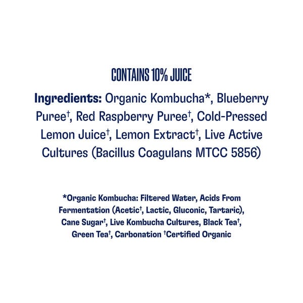 Organic Kombucha*, Blueberry Puree†, Red Raspberry Puree†, Cold-pressed Lemon Juice†, Lemon Extract†, Live Active Cultures (bacillus Coagulans Mtcc 5856), *organic Kombucha: Filtered Water, Acids From Fermentation (acetic†, Lactic, Gluconic, Tartaric), Cane Sugar†, Live Kombucha Cultures, Black Tea†, Green Tea†, Carbonation, †certified Organic