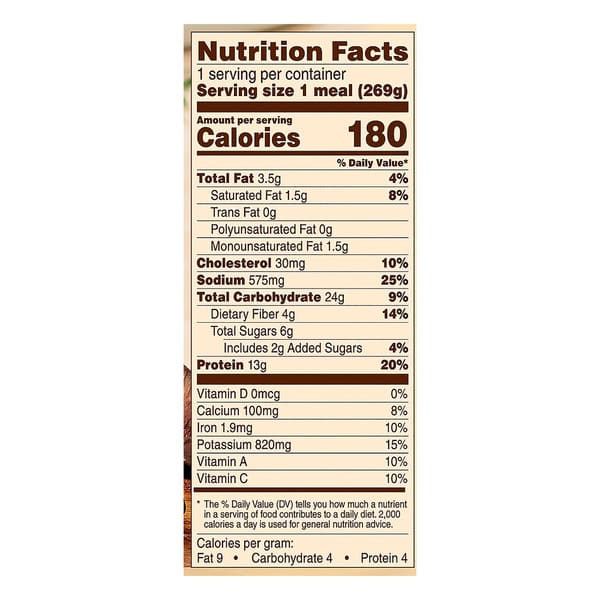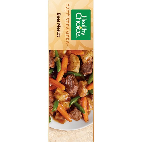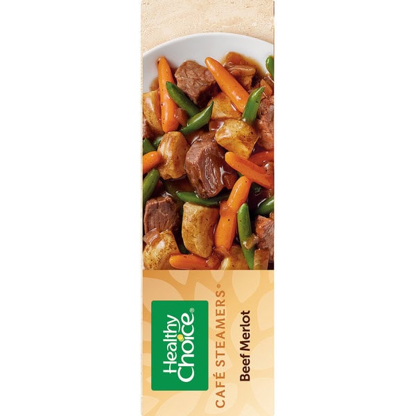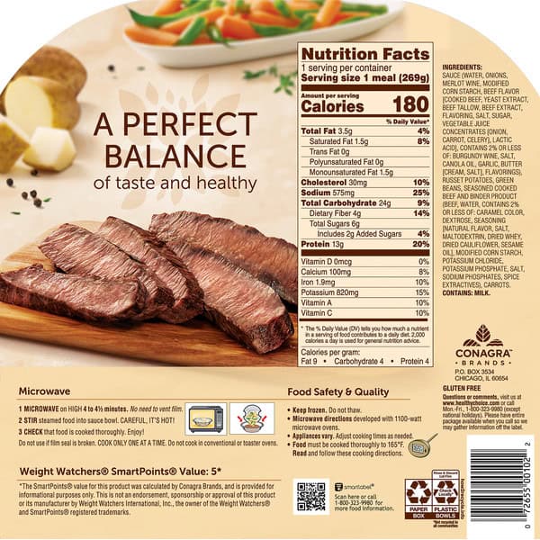 Tender beef strips with russet potatoes & a vegetable medley in rich merlot wine sauce. Per Meal: 180 calories; 1.5 g sat fat (8% DV); 575 mg sodium (25% DV); 6 g total sugars. Gluten free. A perfect balance of taste and healthy. No preservatives. U.S inspected and passed by Department of Agriculture. www.healthychoice.com. how2recycle.info. SmartLabel: Scan or call 1-800-323-9980 for more food information. Questions or comments, visit us at www.healthychoice.com or call Mon.-Fri., 1-800-323-9980 (except national holidays). Please have entire package available when you call so we may gather information off the label. how2recycle.info. Weight Watchers SmartPoints Value: 5 (the SmartPoints value for this product was calculated by Conagra Brands, and is provided for informational purposes only. this is not an endorsement, sponsorship or approval of this product or its manufacturer by Weight Watchers International, Inc. the owner of the Weight Watchers and SmartPoints registered trademarks).