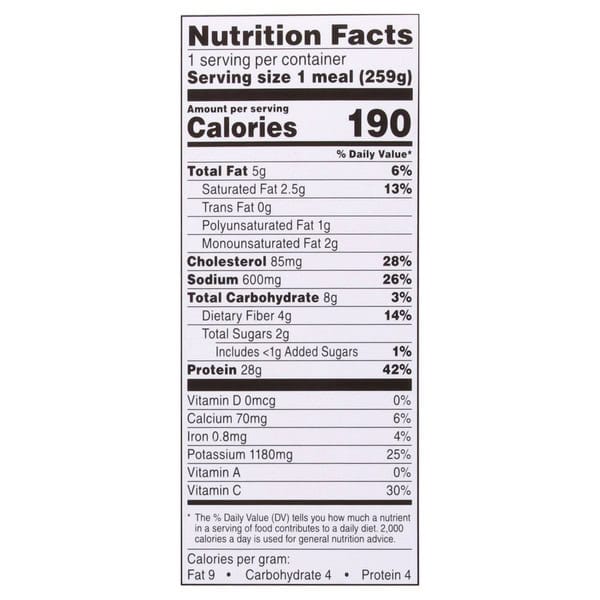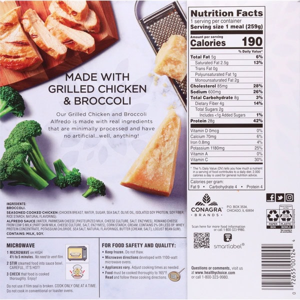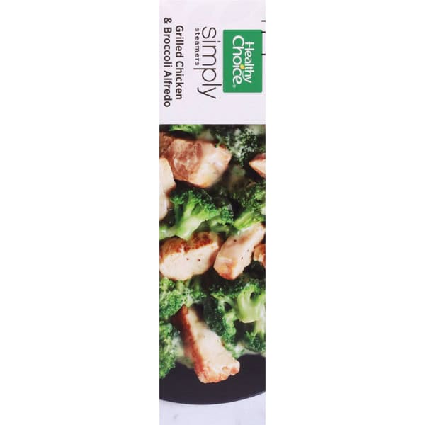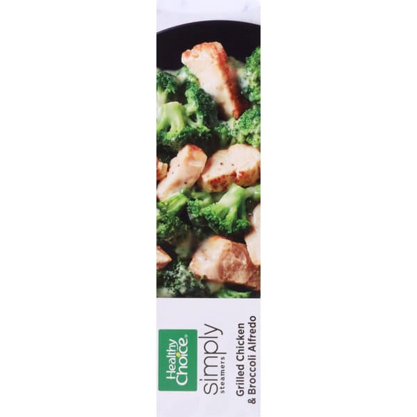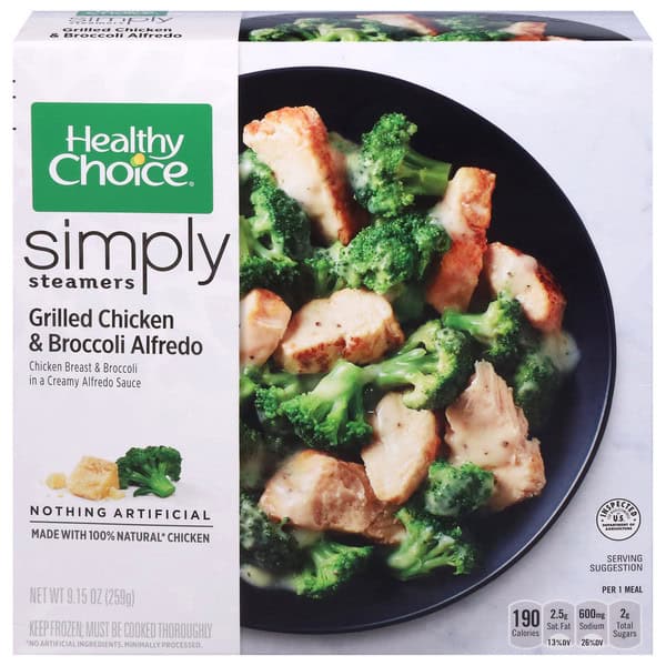 Chicken breast & broccoli in a creamy alfredo sauce. Per Meal: 190 calories; 2.5 g sat fat (13% DV); 600 mg sodium (26% DV); 2 g total sugars. Nothing artificial. Made with 100% natural (No artificial ingredients. Minimally processed) chicken. Made with grilled chicken & broccoli. Our grilled chicken and broccoli alfredo is made with real ingredients that are minimally processed and have no artificial – well, anything! Inspected for wholesomeness by U.S. Department of Agriculture. healthychoice.com. how2recycle.info. Facebook. Twitter. Instagram. SmartLabel: Scan or call 1-800-323-9980 for more food information. Questions or comments, visit us at www.healthychoice.com or call 1-800-323-9980. Weight Watchers SmartPoints Value: 4 (The SmartPoints value for this product was calculated by Conagra Brands, and is provided for informational purposes only. This is not an endorsement, sponsorship or approval of this product or its manufacturer by Weight Watchers International, Inc., the owner of the Weight Watchers and SmartPoints registered trademarks).