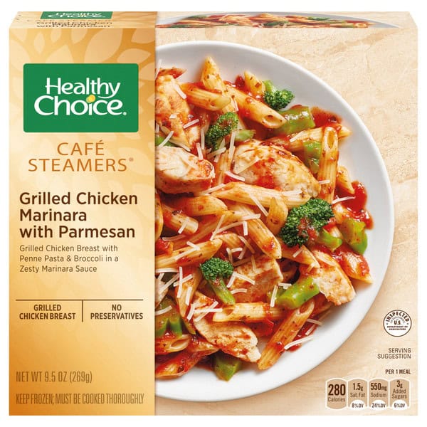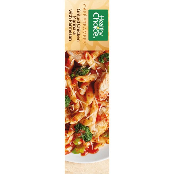 Enjoy satisfying and quick meals with Healthy Choice Café Steamers Grilled Chicken Marinara With Parmesan. This frozen meal combines grilled chicken breast with penne pasta and tender broccoli in a zesty marinara sauce for a delicious and convenient premade meal. Made with no preservatives, GLP-1 friendly, and containing 20 grams of protein, 4 grams of fiber and 280 calories, this tasty pasta dish provides a wholesome microwave meal full of flavor. Perfect for a quick lunch or dinner after a long day, keep this delicious ready-made meal in your freezer to always have healthy meals on hand. Healthy Choice never compromises on ingredients so you can taste the goodness in every bite.