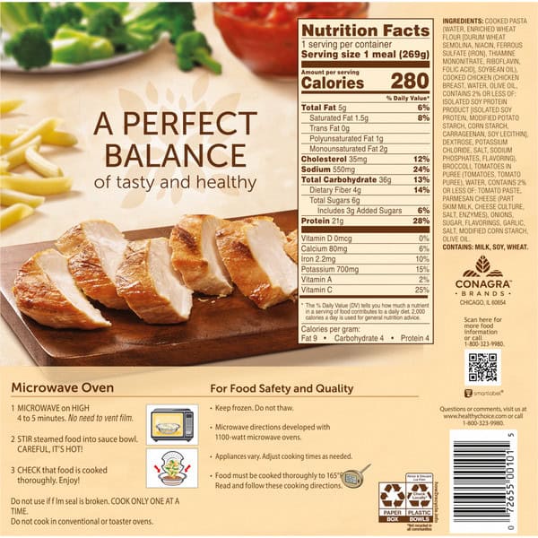 Cooked Pasta (water, Enriched Wheat Flour [durum Wheat Semolina, Niacin, Ferrous Sulfate {iron}, Thiamine Mononitrate, Riboflavin, Folic Acid], Soybean Oil), Cooked Chicken (chicken Breast, Water, Olive Oil, Contains 2% Or Less Of: Isolated Soy Protein Product [isolated Soy Protein, Modified Potato Starch, Corn Starch, Carrageenan, Soy Lecithin], Dextrose, Potassium Chloride, Salt, Sodium Phosphates, Flavoring)), Broccoli, Tomatoes In Puree (tomatoes, Tomato Puree), Water, Contains 2% Or Less Of: Tomato Paste, Parmesan Cheese (part Skim Milk, Cheese Culture, Salt, Enzymes), Onions, Sugar, Flavorings, Garlic, Salt, Modified Corn Starch, Olive Oil, Citric Acid.