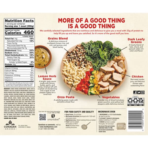 Feel UNSTOPPA-BOWL with Healthy Choice Max Bowl Lemon Herb Chicken Frozen Meals. Made with grilled chicken breast and vegetables served on top of orzo pasta and a multigrain blend with zesty lemon herb vinaigrette, this microwavable meal is an excellent source of protein with 33 grams per serving. Great for busy weeknights or a non-prep lunch, Healthy Choice Max Protein Bowls are easy, healthy meals that are ready in minutes.