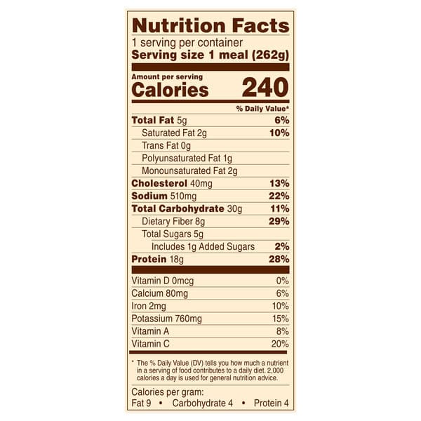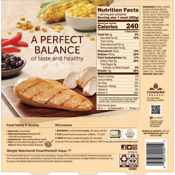 Corn, Cooked Chicken (chicken Breast, Water, Olive Oil, Contains 2% Or Less Of: Isolated Soy Protein Product [isolated Soy Protein, Modified Potato Starch, Corn Starch, Carrageenan, Soy Lecithin], Dextrose, Potassium Chloride, Salt, Sodium Phosphates, Flavoring), Water, Cooked Black Beans (water, Black Beans), Red Bell Peppers, Contains 2% Or Less Of: Cotija Cheese (cultured Part-skim Milk, Salt, Enzymes), Key West Lime Juice (water, Lime Juice Concentrates, Lime Oil), Modified Corn Starch, Cream, Onions, Olive Oil, Guajillo Chile Peppers, Cilantro, Salt, Garlic, Butter (cream, Salt), Canola Oil, Flavoring.