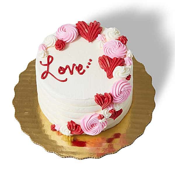 Details Four layers of 5-in. vanilla or chocolate cake filled and iced in buttercream icing. Perfect for Valentine celebration.