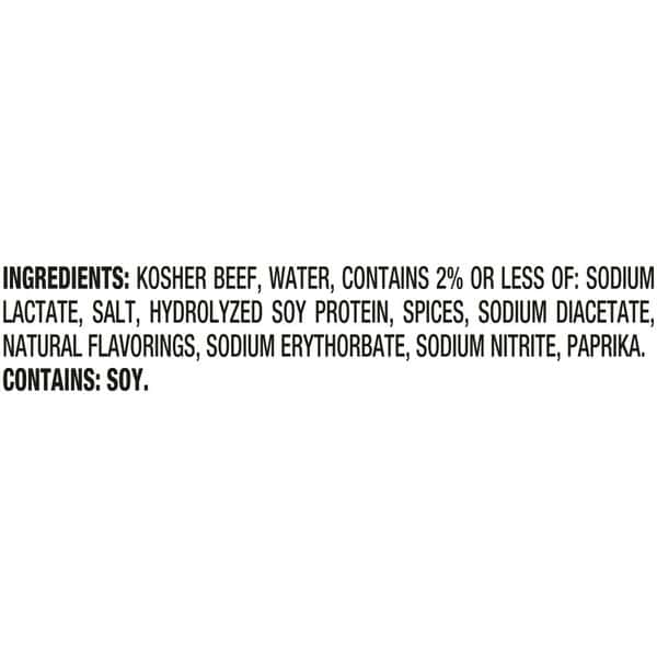 Beef, Water, Contains 2% Or Less Of: Salt, Sodium Lactate, Hydrolyzed Soy Protein, Spices, Sodium Diacetate, Natural Flavorings, Sodium Erythorbate, Paprika, Sodium Nitrite.