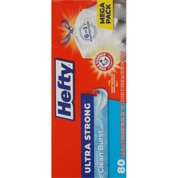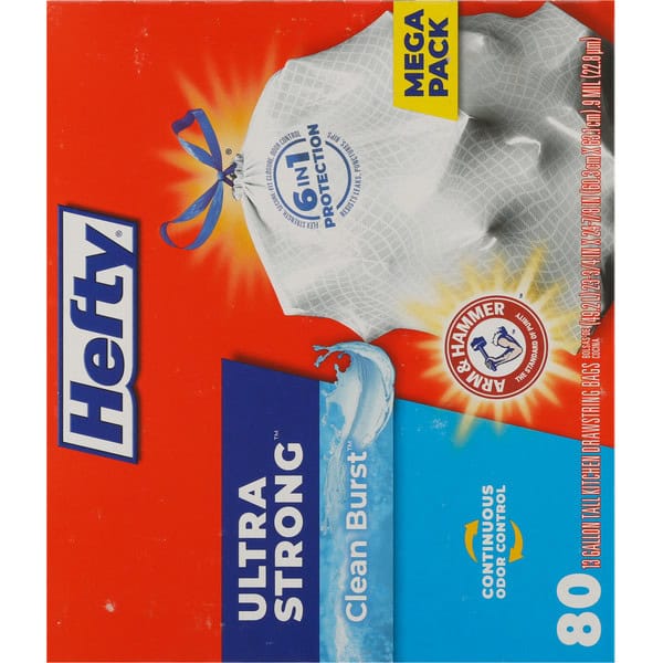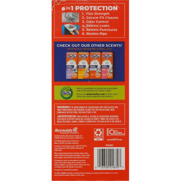 6 in 1 Protection: Flex strength, secure-fit closure, odor control. Resists: leaks, punctures, rips. Continuous odor control. Arm & Hammer: The standard of purity. 6 in Protection: 1. Flex strength. 2. Secure-fit closure. 3. Odor control. 4. Resists leaks. 5. Resists punctures. 6. Resists rips. Hefty is committed to advancing sustainable, end-of-life solutions for plastic waste.