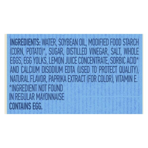 Water, Soybean Oil, Modified Food Starch (corn, Potato)*, Sugar, Distilled Vinegar, Salt, Whole Eggs, Egg Yolks, Lemon Juice Concentrate, Sorbic Acid* And Calcium Disodium Edta (used To Protect Quality), Natural Flavor, Paprika Extract, Vitamin E, *ingredient Not Found In Regular Mayonnaise
