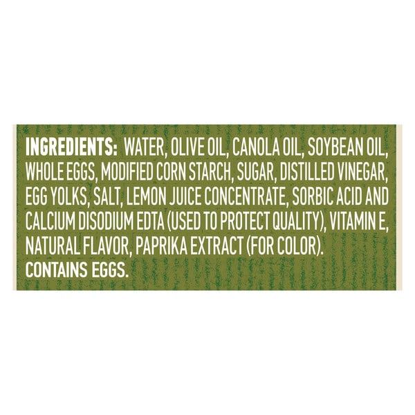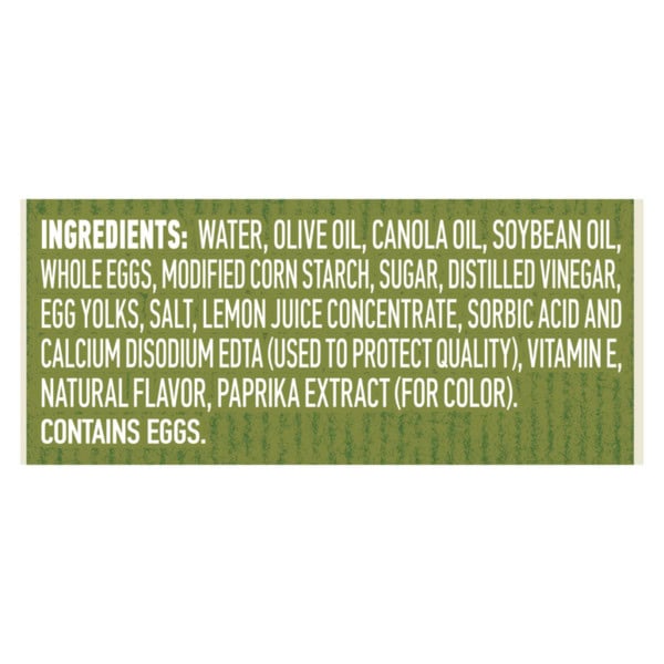 Water, Soybean Oil, Olive Oil, Whole Eggs And Egg Yolks (whole Eggs And Egg Yolks), Sugar, Modified Potato Starch, Vinegar, Salt, Lemon Juice Concentrate, Sorbic Acid And Calcium Disodium Edta (used To Protect Quality) (sorbic Acid (used To Protect Quality) And Calcium Disodium Edta (used To Protect Quality)), Natural Flavors, Extractives Of Paprika.
