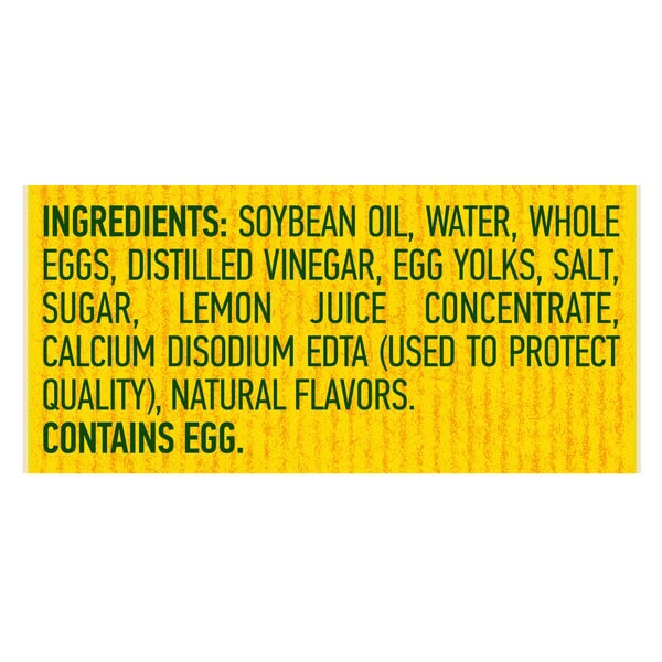 Soybean Oil, Water, Whole Eggs And Egg Yolks (whole Eggs And Egg Yolks), Vinegar, Salt, Sugar, Lemon Juice Concentrate, Calcium Disodium Edta (used To Protect Quality), Natural Flavors.