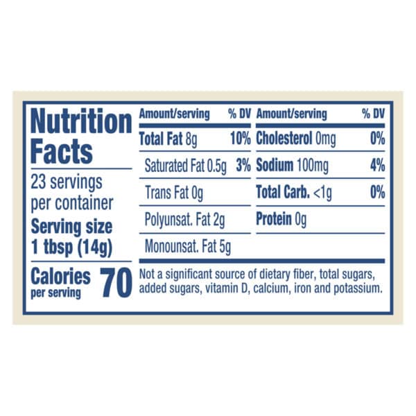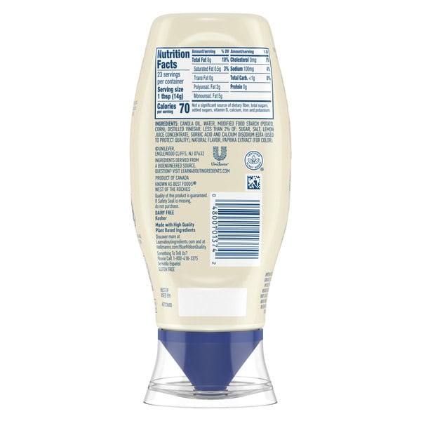 • Hellmann’s Vegan Dressing & Spread is gluten free and cholesterol free (contains 8g of fat per serving).