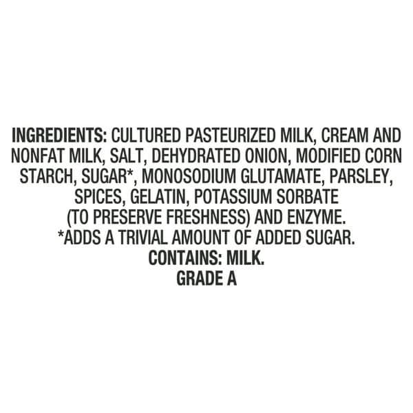 Cultured Pasteurized Milk, Cream And Nonfat Milk, Salt, Dehydrated Onion, Modified Corn Starch, Sugar*, Monosodium Glutamate, Parsley, Spices, Gelatin, Potassium Sorbate (to Preserve Freshness) And Enzyme.