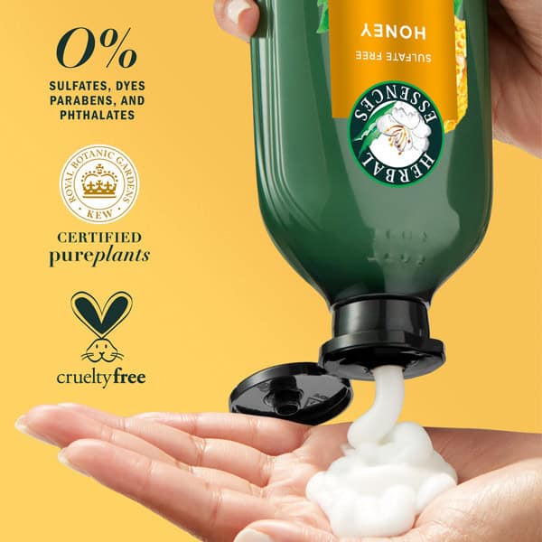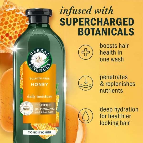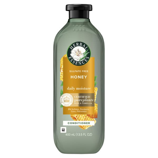Looking for conditioner for your hair that’s deeply nourishing yet surprisingly lightweight? Herbal Essences Sulfate Free Honey Daily Moisture Conditioner is formulated to give you soft, smooth, and moisturized hair with a weightless feel. It contains: Luscious honey Pure aloe vera Lightweight camellia oil NO sulfates, parabens, dyes, or phthalates 96% natural origin ingredients* Meet camellia oil. Unlike other commonly used ingredients that can make hair feel heavy, camellia oil is amazingly lightweight. It mimics the natural oils found in healthy hair-the oils that our hair tends to lose when washed. That makes camellia oil one of nature’s most effective yet lightweight nourishers. You’ll feel the difference as it instantly soaks in, leaving you with weightlessly soft hair. With the scents of fruity, creamy, and sumptuous honey notes, Herbal Essences Honey Daily Moisture Conditioner is made for all hair types, especially dry hair. The plant ingredients inside are certified by the world’s leading experts at Royal Botanic Gardens, Kew. And of course, it’s Certified PETA Cruelty-Free. How to Use:  1. Apply generously to wet hair, working through every strand. For longer or thinker hair, leave in 1 – 3 minutes before rinsing2. Rinse thoroughly3. For best results, use with the matching Herbal Essences Sulfate Free Honey Daily Moisture Shampoo Our NEW plant-inspired bottles are: Made with 25% less plastic (13.5 oz/400 mL bottles vs. Herbal Essences Smooth Rose Hips 13.5 oz/400 mL, g/mL) The raised dots and lines at the front of the bottles are designed to help consumers with low vision differentiate our shampoos from conditioners. *Natural source ingredients with limited processing and purified water. After processing, natural source ingredients maintain ≥50% of their natural origin material.