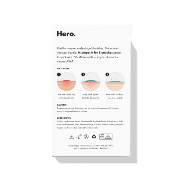 Directions: 1. Start with a clean, dry early-stage blemish. 2. Apply patch & press lightly for 20 seconds. 3. Leave on for 6-8 hours. Repeat as needed.