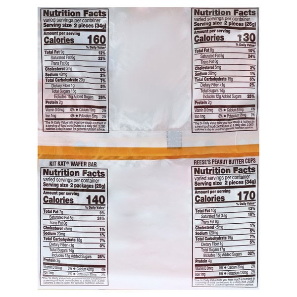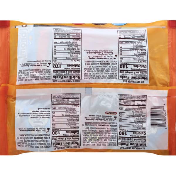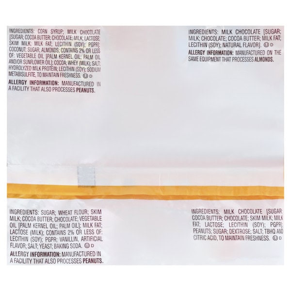 Almond Joy Candy Bar: Corn Syrup; Milk Chocolate [Sugar; Cocoa Butter; Chocolate; Milk; Lactose; Skim Milk; Milk Fat; Lecithin (Soy); PGPR; Coconut; Sugar; Almonds; Contains 2% or Less of: Vegetable Oil [Palm Kernel Oil; Palm Oil and/or Sunflower Oil]; Cocoa; Whey (Milk); Salt; Hydrolyzed Milk Protein; Lecithin (Soy); Sodium Metabisulfite, to Maintain Freshness. Hershey’s Milk Chocolate: Milk Chocolate [Sugar; Milk; Chocolate; Cocoa Butter; Milk Fat; Lecithin (Soy); Natural Flavor]. Kitkat Wafer Bar: Sugar; Wheat Flour; Skim Milk; Cocoa Butter; Chocolate; Vegetable Oil [Palm Kernel Oil; Palm Oil]; Milk Fat; Lactose (Milk); Contains 2% or Less of: Lecithin (Soy); PGPR; Vanillin, Artificial Flavor; Salt; Yeast; Baking Soda. Reese’s Peanut Butter Cups: Milk Chocolate [Sugar; Cocoa Butter; Chocolate; Skim Milk; Milk Fat; Lactose; Lecithin (Soy); PGPR]; Peanuts; Sugar; Dextrose; Salt; TBHQ and Citric Acid, to Maintain Freshness.