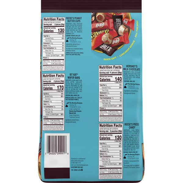 Hershey’s milk chocolate – contains: milk, soy., reese’s peanut butter cups – contains: peanuts, milk, soy., reese’s pieces candy – contains: peanuts, milk, soy., kit kat wafer bars – contains: milk, wheat, soy. Manufactured in a facility that processes peanuts.