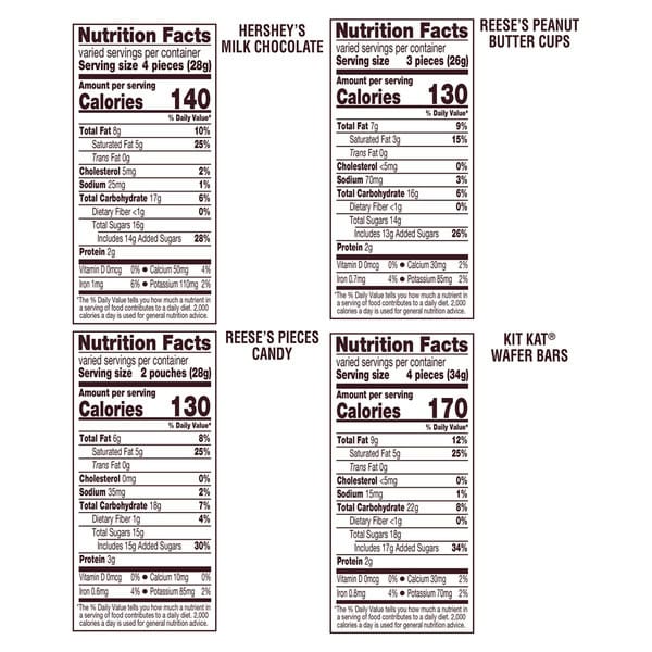 Hershey’s Milk Chocolate – Milk Chocolate (sugar, Chocolate, Milk, Cocoa Butter, Skim Milk, Milk Fat, Lecithin (soy), Pgpr, Natural Flavor).,reese’s Peanut Butter Cups – Milk Chocolate (sugar, Cocoa Butter, Chocolate, Skim Milk, Milk Fat, Lactose Lecithin (soy), Pgpr), Peanuts Sugar, Dextrose, Salt, Tbhq & Citric Acid (to Maintain Freshness).,reese’s Pieces Candy – Sugar, Partially Defatted Peanuts, Hydrogenated Vegetable Oil (palm Kernel Oil Soybean Oil), Corn Syrup Solids Dextrose, Contains 2% Or Less Of: Palm Kernel Oil, Corn Syrup, Salt, Artificial Color (including Yellow 5 Lake, Yellow 6 Lake, Red 40 Lake, Blue 1 Lake), Modified Cornstarch Confectioner’s Glaze, Lecithin (soy), Vanillin (artificial Flavor), Carnauba Wax, Milk.,kit Kat Wafer Bars – Sugar, Wheat Flour Cocoa Butter, Chocolate Lactose (milk), Vegetable Oil Palm Oil, Palm Kernel Oil), Skim Milk, Milk Fat, Contains 2% Or Less Of: Lecithin (soy), Pgpr Vanillin (artificial Flavor), Salt Yeast, Baking Soda.