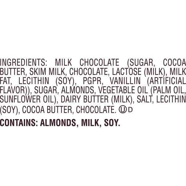 Milk Chocolate, Sugar, Cocoa Butter, Skim Milk, Chocolate, Lactose (milk), Milk Fat, Lecithin (soy), Pgpr, Vanillin (artificial Flavor), Sugar, Almonds, Vegetable Oil (palm Oil, Sunflower Oil), Dairy Butter (milk), Salt, Lecithin (soy), Cocoa Butter, Chocolate