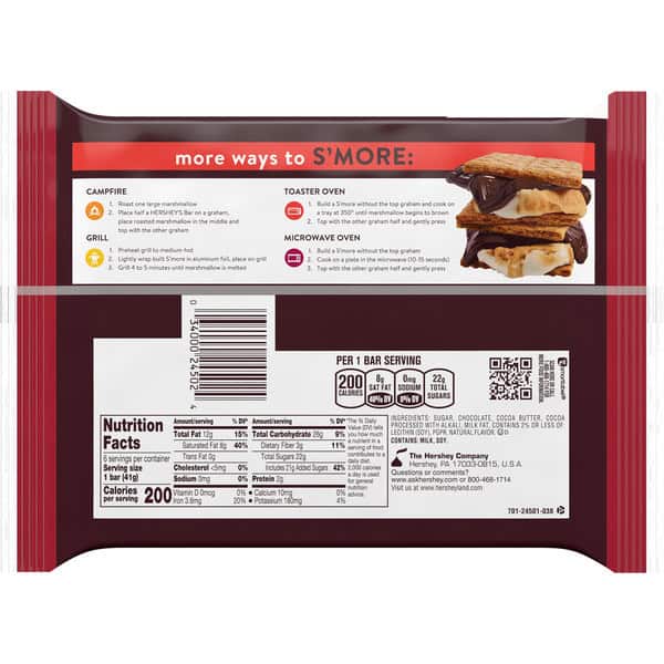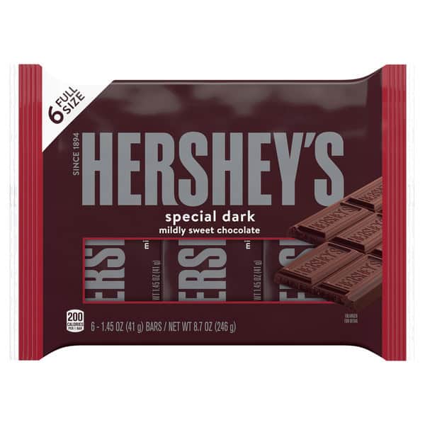 • Contains one (1) 6-count pack of 1.45-ounce HERSHEY’S SPECIAL DARK Mildly Sweet Chocolate Candy Bars