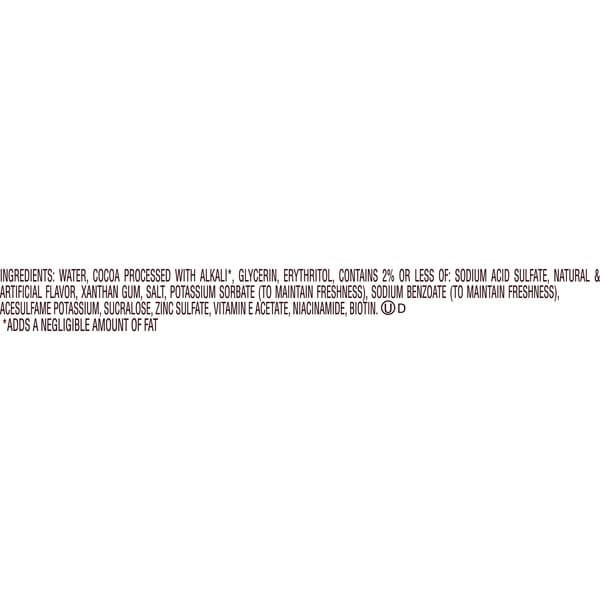Water, Cocoa Processed With Alkali *, Glycerin, Erythritol, Contains 2% Or Less Of: Sodium Acid Sulfate, Natural & Artificial Flavor, Xanthan Gum, Salt, Potassium Sorbate (to Maintain Freshness), Sodium Benzoate (to Maintain Freshness), Acesulfame Potassium, Sucralose, Zinc Sulfate, Vitamin E Acetate, Niacinamide, Biotin. Ud * Adds A Negligible Amount Of Fat