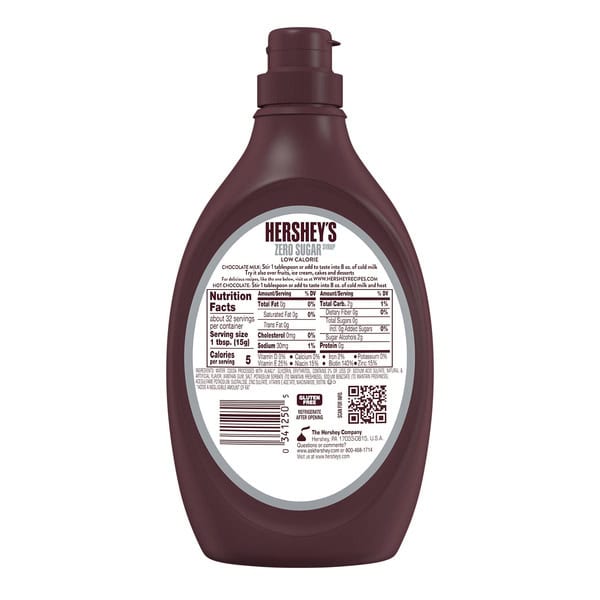 No sugar? No problem! If you’re searching for a chocolatey alternative to the genuine taste you know and love, HERSHEY’S Zero Sugar chocolate flavored syrup allows you to savor the iconic flavor of HERSHEY’S chocolate flavored syrup with zero sugar. This sugarless chocolate syrup is aspartame free, kosher certified, gluten free and a low calorie option packed with genuine chocolate flavor. Drizzle some of this tasty zero sugar syrup on top of creative baked goods and treats. No matter what you’re making or who is at your gathering, pop open the lid, then squeeze, swirl, dot or drizzle the syrup onto some of your favorite drinks and desserts. Squeeze the syrup onto your ice cream sundaes as a tasty topping or stir it into a cold glass of milk — chocolatey milk mustaches, anyone? Want a little sweetness in your midday coffee to make a mocha, some extra goodness in your hot cocoa or a chocolatey drizzle over your dessert? Enjoy the sweet, delicious taste of sugar free chocolate syrup on everything from cakes to cookies. When your guests require sugar free options, they can enjoy your snacks like everyone else. Once you’re finished, place the bottle in the refrigerator to keep the syrup fresh.