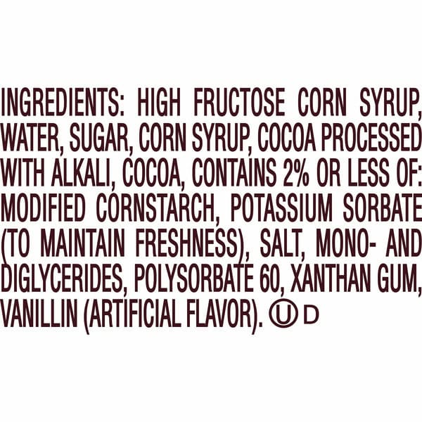 High Fructose Corn Syrup, Sugar, Water, Corn Syrup, Cocoa Processed With Alkali, Cocoa, Contains 2% Or Less Of: Modified Cornstarch, Potassium Sorbate (preservative), Salt, Mono And Diglycerides, Polysorbate 60, Xanthan Gum, Vanillin, Artificial Flavor