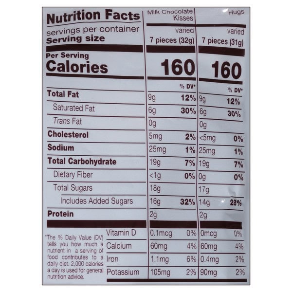Milk Chocolate Kisses: Milk Chocolate Kisses: Milk Chocolate (sugar, Milk Chocolate, Cocoa Butter, Milk Fat, Lecithin (soy), Natural Flavor). Hugs: Milk Chocolate (sugar, Milk, Chocolate, Cocoa Butter, Milk Fat, Lecithin (soy), Pgpr, Natural Flavor), Sugar, Vegetable Oil (palm Oil, Shea Oal Sunflower Oil, Palm Kernel Oil, &/or Safflower Oil), Skim Milk, Corn Syrup Solids, Lactose (milk), Contains 2% Or Less Of: Lecithin (soy), Pgpr, Vanillin (artificial Flavor).