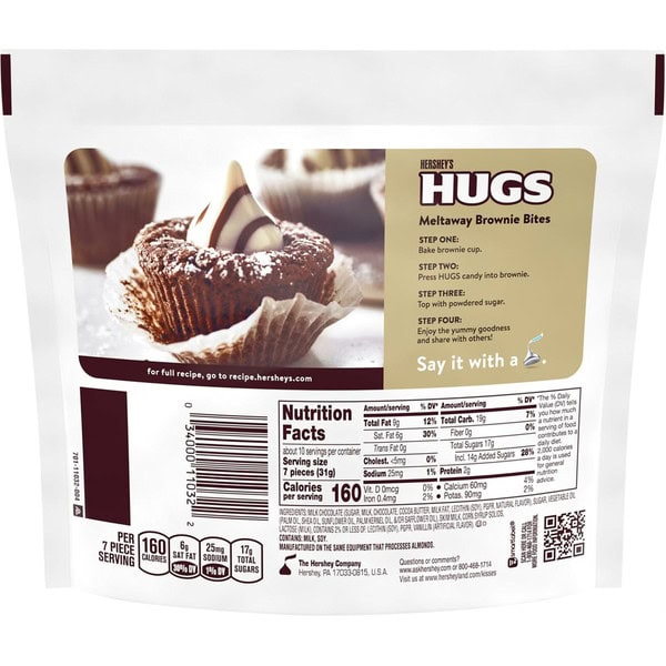 HERSHEY’S HUGS milk chocolate and white creme candies include the milk chocolate taste you know and love hugged by smooth, delectable white creme. Individually wrapped in stunning striped foils, these treats make the perfect edible decoration for any season. Unwrap them, and you’ll find even more stripes thanks to the contrast of milk chocolate and white creme. Fill your candy dishes, lunch boxes and snack drawers at home and work with these HERSHEY’S HUGS milk chocolate and white creme treats. HUGS candies are easy to enjoy anywhere, whether you’re taking a snack break at work or feeling peckish on the go. Get ready to savor each decadent bite of smooth white creme over sweet milk chocolate, and don’t forget to give some of these treats out at Easter gatherings, Halloween parties, holiday events and Valentine’s Day exchanges. Even on ordinary days, everyone can use a hug and a HUGS candy, which means it’s the perfect treat for decorating your home and cubicle. For extra fun, place these candies on your best baked cookies and cupcakes — anyone you share with is sure to beg for your secret recipe!