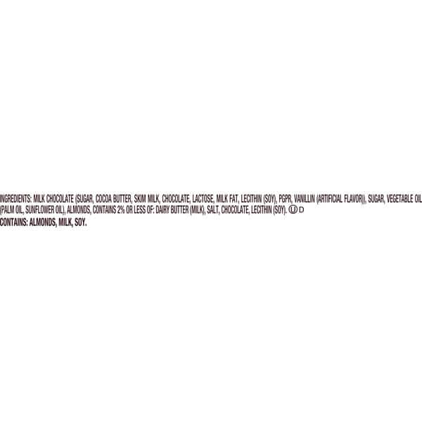 Milk Chocolate (sugar, Cocoa Butter, Skim Milk, Chocolate, Lactose, Milk Fat, Lecithin (soy), Pgpr, Vanillin (artificial Flavor), Sugar, Vegetable Oil (palm Oil, Sunflower Oil), Almonds, Contains 2% Or Less Of: Dairy Butter (milk), Salt, Chocolate, Lecithin (soy), Ud