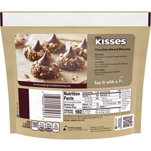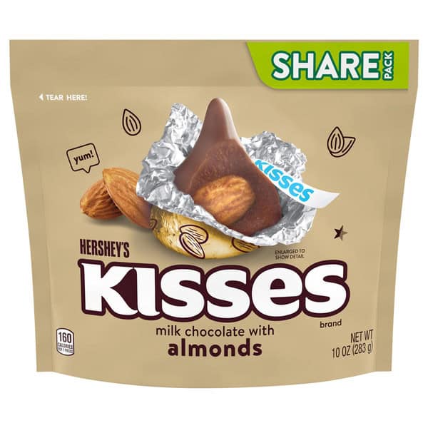 • The smooth, creamy HERSHEY’S KISSES milk chocolate you’ve come to love with fresh, crisp almonds for a crunch you won’t want to miss in your Halloween, Christmas, Valentine’s Day and Easter candy selections