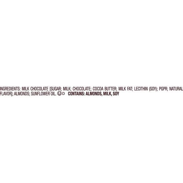 Milk Chocolate [sugar; Milk; Chocolate; Cocoa Butter; Milk Fat; Lecithin (soy); Pgpr; Natural Flavor]; Almonds; Sunflower Oil. Ud Contains: Almonds, Milk, Soy