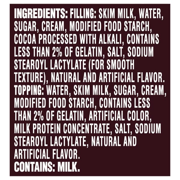 Filling: Skim Milk, Water, Sugar, Cream, Modified Food Starch, Cocoa Processed With Alkali, Contains Less Than 2% Of Gelatin, Salt, Sodium Stearoyl Lactylate (for Smooth Texture), Natural And Artificial Flavor. Topping: Water, Skim Milk, Sugar, Cream, Modified Food Starch, Contains Less Than 2% Of Gelatin, Artificial Color, Milk Protein Concentrate, Salt, Sodium Stearoyl Lactylate, Natural And Artificial Flavor.
