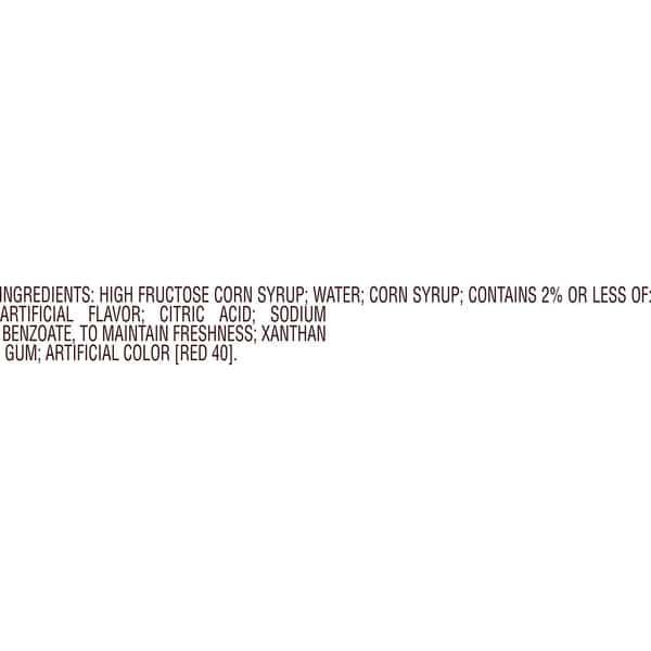 Ngredients: High Fructose Corn Syrup; Water; Corn Syrup; Contains 2% Or Less Of: Artificial Flavor; Citric Acid; Sodium Benzoate, To Maintain Freshness; Xanthan Gum; Artificial Color [red 40].