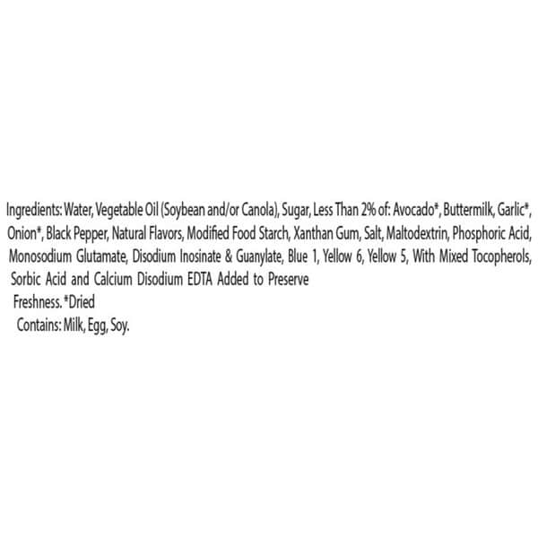 Water, Vegetable Oil (soybean And/or Canola), Sugar, Less Than 2% Of: Avocado*, Buttermilk, Garlic*, Onion*, Black Pepper, Egg Yolk, Vinegar, Natural Flavors, Modified Food Starch, Xanthan Gum, Salt, Maltodextrin, Phosphoric Acid, Monosodium Glutamate, Honey, Disodium Inosinate And Guanylate, Blue 1, Yellow 6, Yellow 5, With Mixed Tocopherols, Sorbic Acid And Calcium Disodium Edta Added To Preserve Freshness.