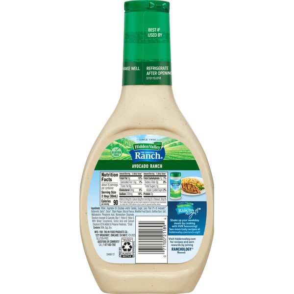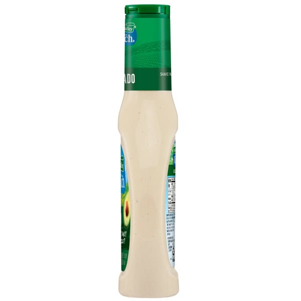 Enjoy the fresh taste of avocado anytime with Hidden Valley® Avocado Ranch Topping and Dressing. The flip cap lid is easy to open and close while delivering a more controlled pour for fewer messes. For delicious side dishes, mix avocado dressing with pasta or potatoes. Or toss with mixed greens, chopped tomatoes and chicken for a quick and easy dinner. Hidden Valley® ranch topping and dressing also makes a delicious addition to sandwiches, tacos and burgers, or as a dip with a vegetable tray or tortilla chips. This gluten free topping and dressing made with real avocado is as versatile as it is tasty.