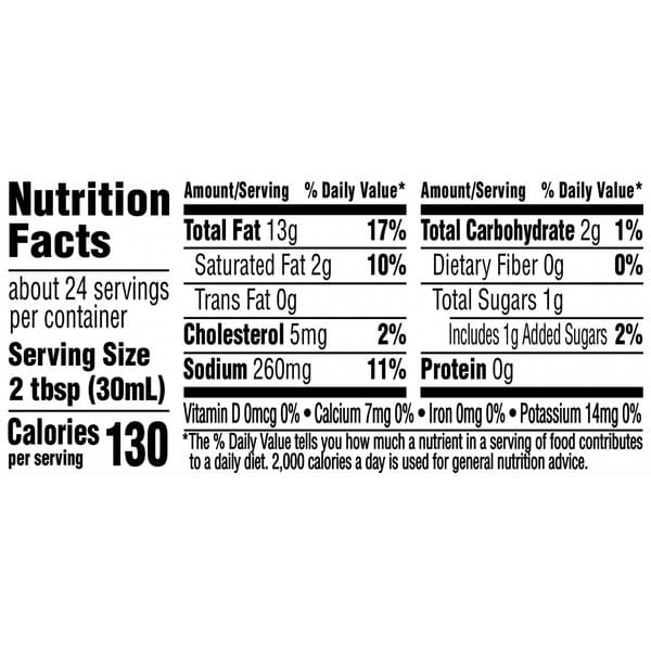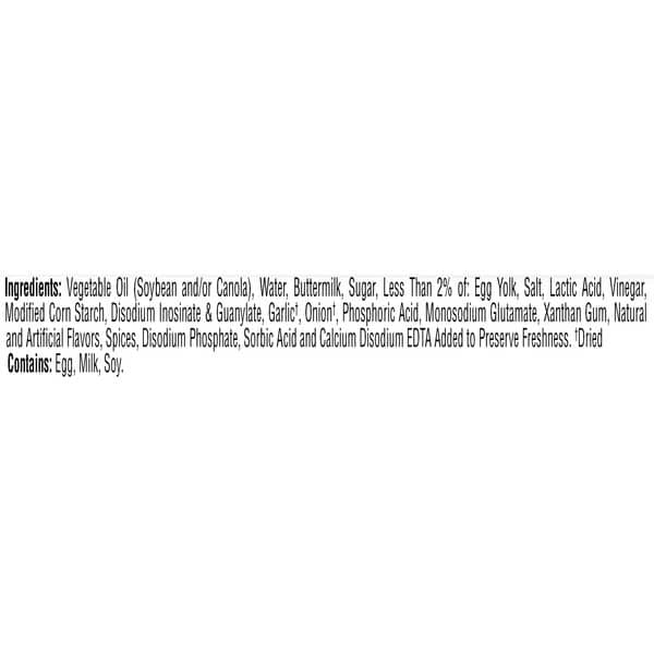 Vegetable Oil (soybean And/or Canola), Water, Sugar, Less Than 2% Of: Egg Yolk, Buttermilk, Salt, Lactic Acid, Vinegar, Modified Food Starch, Disodium Inosinate And Guanylate, Garlic*, Onion*, Phosphoric Acid, Monosodium Glutamate, Xanthan Gum, Natural And Artificial Flavors, Spices, Disodium Phosphate, Sorbic Acid And Calcium Disodium Edta Added To Preserve Freshness.