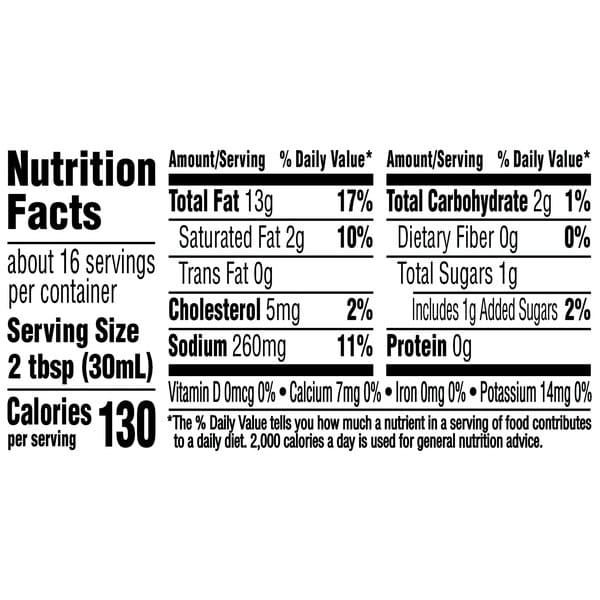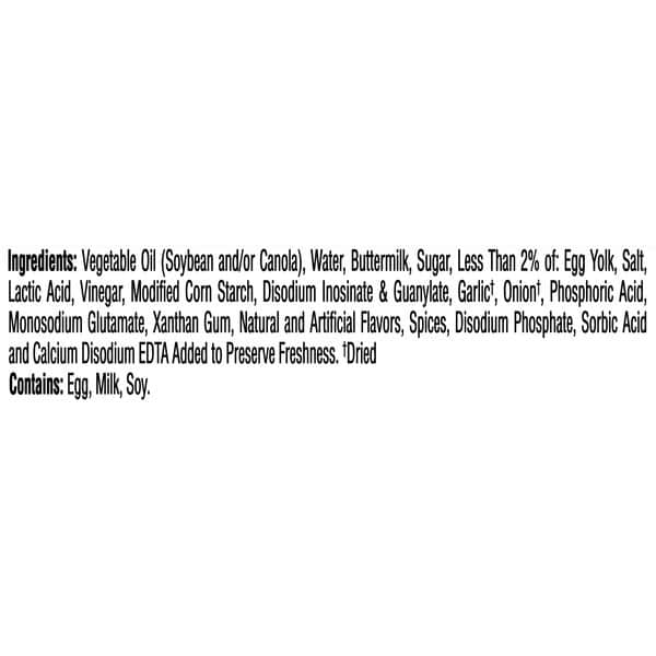 Vegetable Oil (soybean And/or Canola), Water, Buttermilk, Sugar, Less Than 2% Of: Egg Yolk, Salt, Lactic Acid, Vinegar, Modified Corn Starch, Disodium Inosinate & Guanylate, Garlic†, Onion†, Phosphoric Acid, Monosodium Glutamate, Xanthan Gum, Natural And Artificial Flavors, Spices, Disodium Phosphate, Sorbic Acid And Calcium Disodium Edta Added To Preserve Freshness, †dried