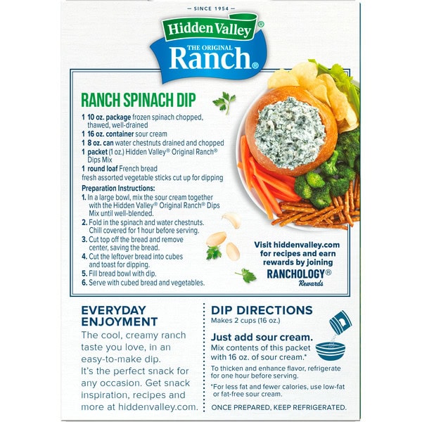 Whip up a creamy chip and veggie dip in minutes with Hidden Valley® Dips Mix in Original Ranch® flavor. Just add this dry mix to 16 ounces of sour cream, refrigerate for 1 hour, and you’re ready to take a delicious Original Ranch® dipping sauce to the party, or keep it at home for yourself. Serve with veggies, crackers or pretzels. You can also use this dip mix to make an Original Ranch® Spinach dip by adding 16 ounces of sour cream, 10 ounces of chopped spinach, and 8 ounces of chopped chestnuts. Or use it dry as a seasoning to flavor side dishes or spice up easy meals. Sprinkle the Original Ranch® dry mix over hot buttered popcorn, mashed potatoes, or chicken to add a zesty flavor. The possibilities are endless with Hidden Valley®.