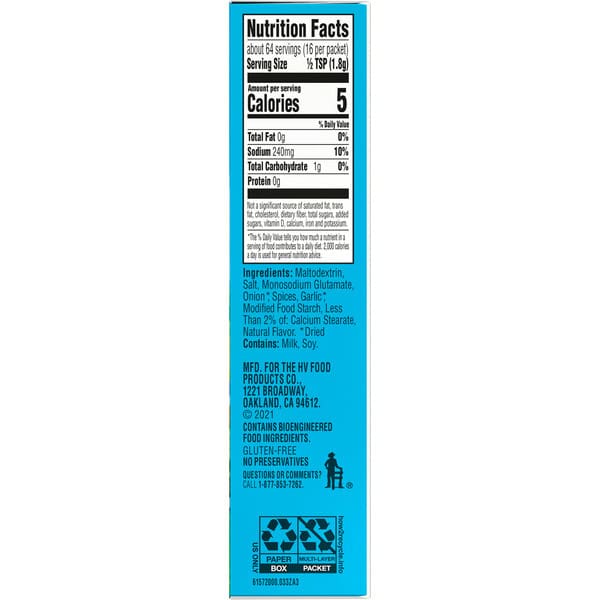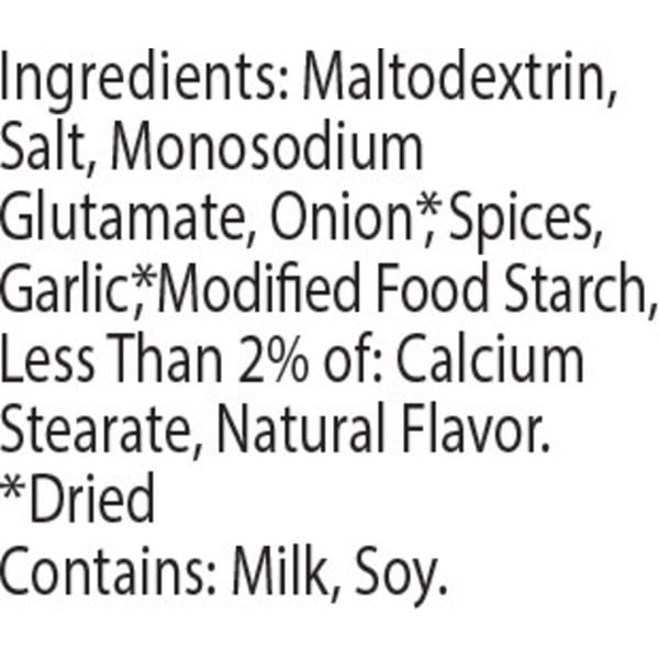 Maltodextrin, Salt, Monosodium Glutamate, Onion*, Spices, Garlic*, Modified Food Starch, Less Than 2% Of: Calcium Stearate, Natural Flavor, *dried