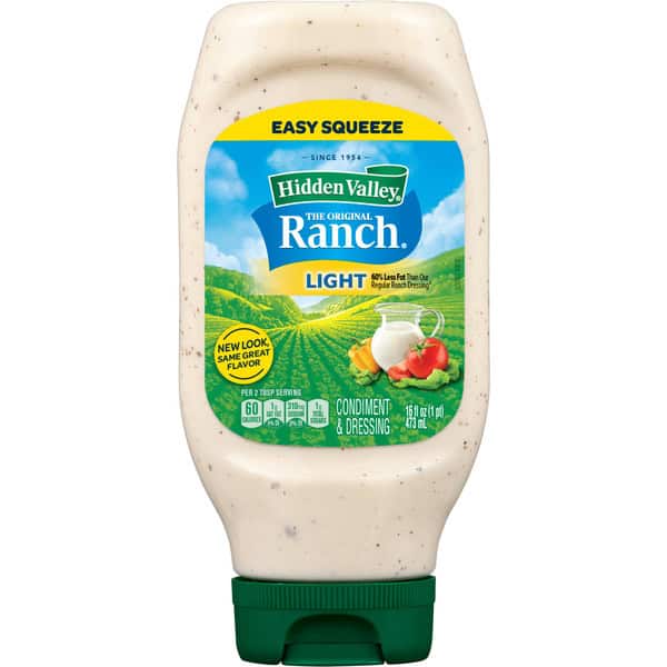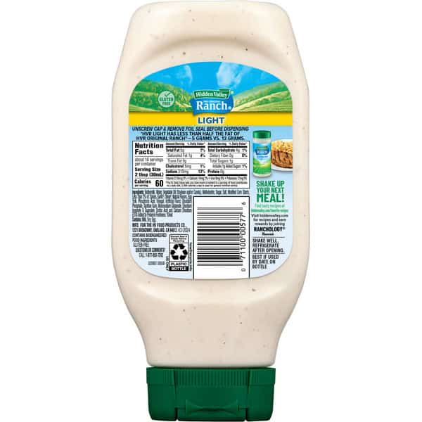 Try a light take on America’s Favorite Ranch (1). The Hidden Valley Light Ranch Condiment and Dressing gives you that tangy flavor to add to all your favorite foods 50% fewer calories per serving compared to Hidden Valley Original Ranch Dressing. This thick and creamy topping is made with Hidden Valley’s secret blend of herbs and spices, all blended with the irresistible goodness of the ranch you know and crave. Dip, dunk or drizzle it on bowls, salads and more. Real buttermilk. Real ranch. Real good. This gluten free ranch comes in a no mess easy squeeze bottle. Enjoy the classic taste of ranch with 60% less fat than regular Hidden Valley Ranch dressing (2). (1) Based on IRI unit sales data L52W ending 8/25/24 for Hidden Valley Original Ranch. (2) Hidden Valley Light Ranch has less than half the fat of regular Hidden Valley Ranch – 5 grams vs. 13 grams.