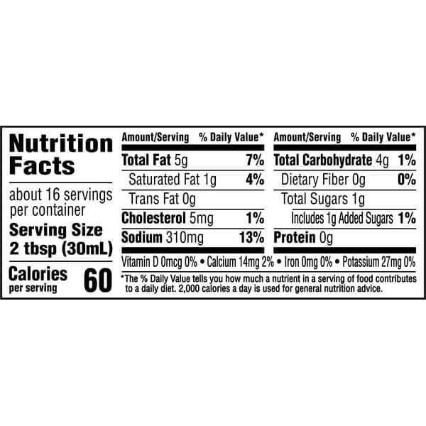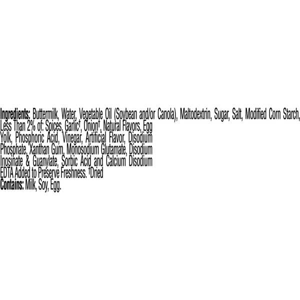 Buttermilk, Water, Vegetable Oil (soybean And/or Canola), Maltodextrin, Sugar, Salt, Modified Corn Starch, Less Than 2% Of: Spices, Garlic†, Onion†, Natural Flavors, Egg Yolk, Phosphoric Acid, Vinegar, Artificial Flavor, Disodium Phosphate, Disodium Phosphate, Xanthan Gum, Monosodium Glutamate, Disodium Inosinate & Guanylate, Sorbic Acid And Calcium Disodium Edta Added To Preserve Freshness, †dried
