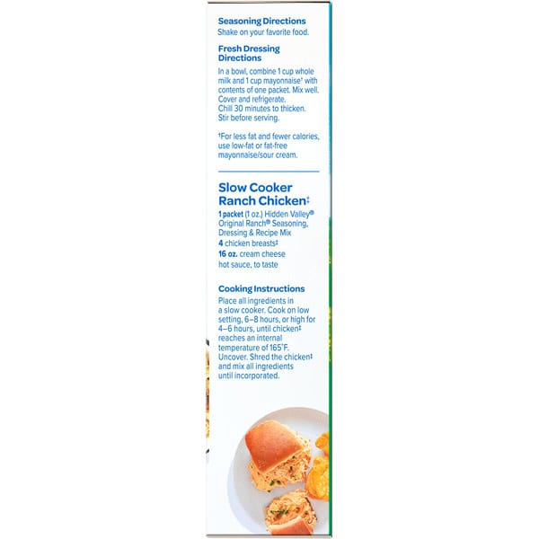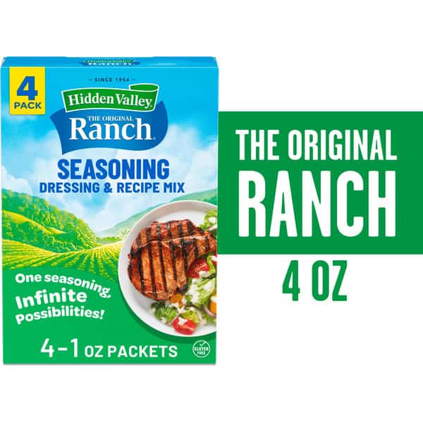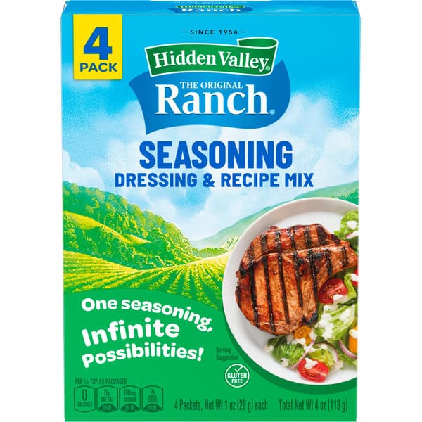 With Hidden Valley Original Ranch Seasoning, Dressing and Recipe Mix, it’s easy to add the cool and zesty taste of ranch to all your favorite foods. Just sprinkle over everything: chicken, pizza, veggies and even savory snacks like popcorn. This ranch seasoning gives you lots of versatility. For creative meal ideas with bold, unique flavors, use this seasoning with its special blend of dry herbs and spices to make delicious entrees and innovative side dishes. This convenient 1 ounce packet is ready to rip open and start cooking, making it perfect to help create a quick meal or snack. Check out the back of the packet for a quick and easy Original Ranch pork chops recipe to get your creative culinary juices flowing. One seasoning, infinite possibilities. (1) Based on IRI unit sales data L52WE 08/25/24 for Hidden Valley Original Ranch.
